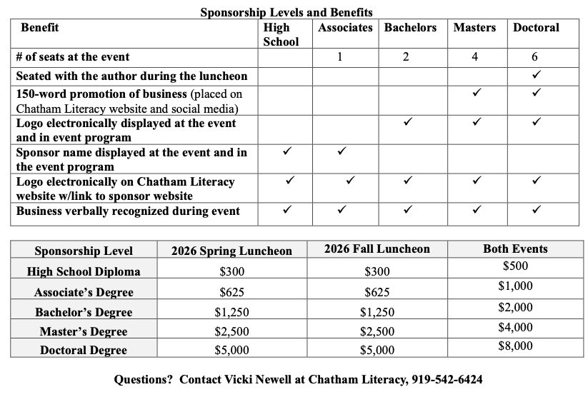 Without partners like you, we cannot accomplish this mission. Chatham Literacy is entirely dependent on grants, donations, public events and business sponsorships. We hold two fundraisers each year. All proceeds fund Chatham Literacy’s free one-on-one and small-group instruction. We are proud to share that we provide adult literacy through multiple learning platforms: in-person learning, distance learning, digital learning app or a combination of these learning platforms.