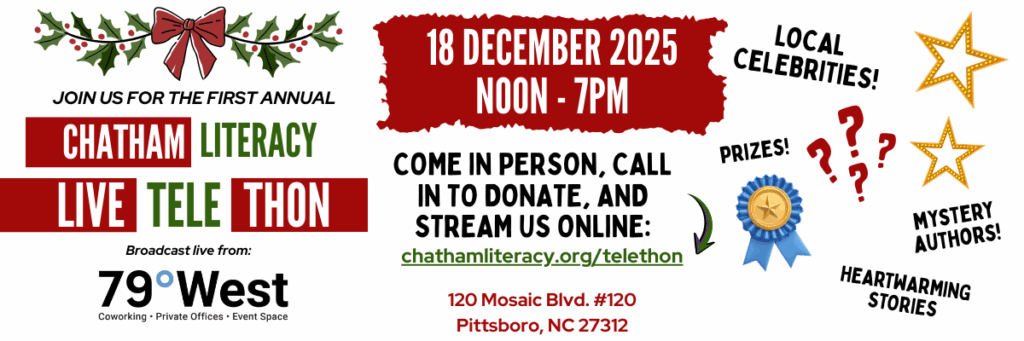 Get ready for the 1st Annual Chatham Literacy Light Up For Literacy Benefit Telethon. We will be streaming LIVE on the hour from 79 West in Pittsboro on December 18th from noon until 7pm. Come join us in person, stream us online, call in to donate, and be prepared to HAVE SOME FUN!!! Don’t miss this electrifying event!